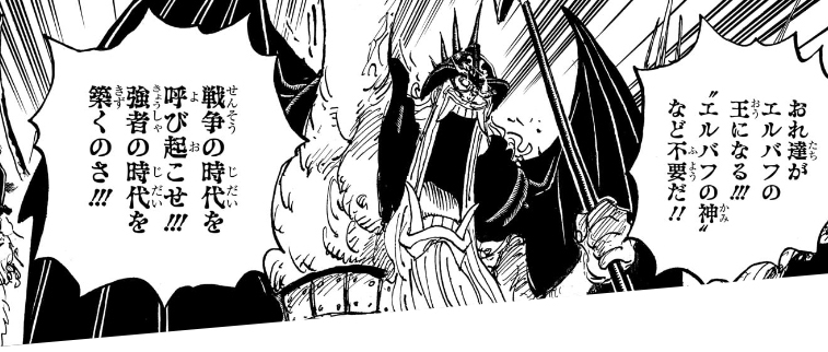 何よりキモいのは、「おれ達がエルバフの王になるから “エルバフの神”など不要だ」という論理と、それが「戦争の時代を呼び起こし、強者の時代を築く」事につながるという論理の意味不明さです。