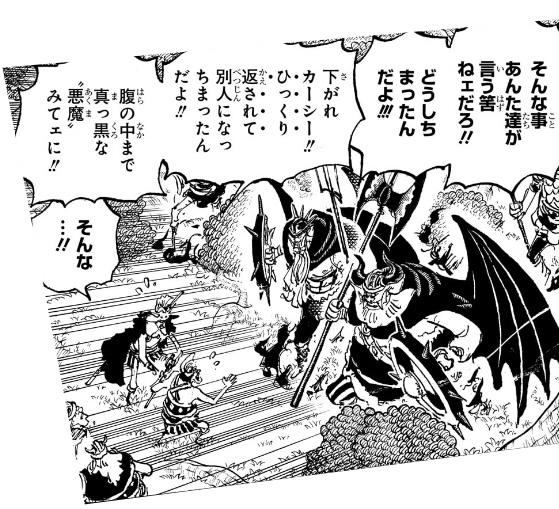 前話の時点で、「お頭達どうしちまったんだ!! バカなこと言ってないで止まってくれ!!」「あの人はおれ達の憧れの人だろう!! 正気を取り戻してくれ!!」のように言わせておけば、今話の描写は丸々不要でした。
