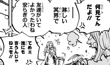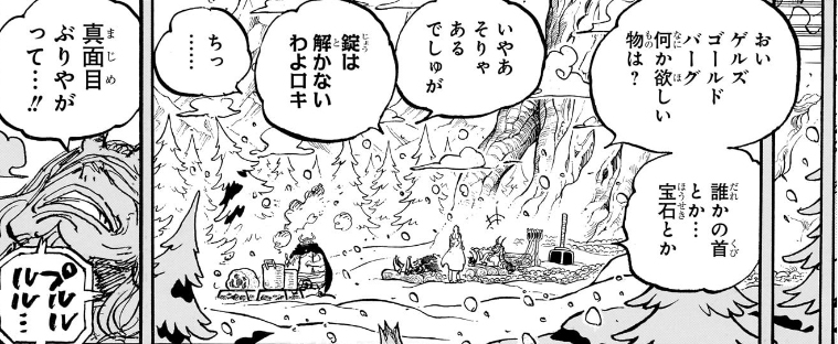 後半では、ジビエが「冥界」に落ちてルフィと合流して、イムの覇気に気づき、急いで「陽界」に戻るという流れになったため、一見話が進んだように見えるかもしれませんが、こちらは本来描くべき「ハラルドの死の意味」や「ロキの本意」について依然何も語られておらず、茶番シーンを描き続けるばかりで、全て放置されたままただ「陽界に戻る」という流れを示されただけなので、中身が全くありません。