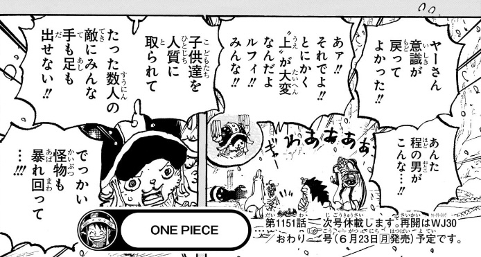 1151話、「もういいわかった!!!」というサブタイトルを見た時、読者の批判の声が増えている事に対する作者の心の声(「もうわかったからみなまで言うな」というメタツッコミ)かと思ってドキッとしてしまいましたが、内容読んだところ、「何もわかってなかった」ので杞憂でした笑