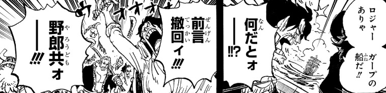 もしかしたら尾田さんはロジャーとガープはルパンと銭形みたいな関係性を描きたいのかも??とちょっと思った。劣化版というか全然そんな関係性を描ききれてないけど。。