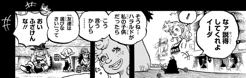 しかもハラルドは世界政府の加盟国だろうが非加盟国だろうが構わず国交を広げようとしてたんだよね。今話でエニシで海軍と衝突したエピソードを描いたのは、そういうハラルドの行動は世界政府の意向に反するものだった、という描写だと理解した。