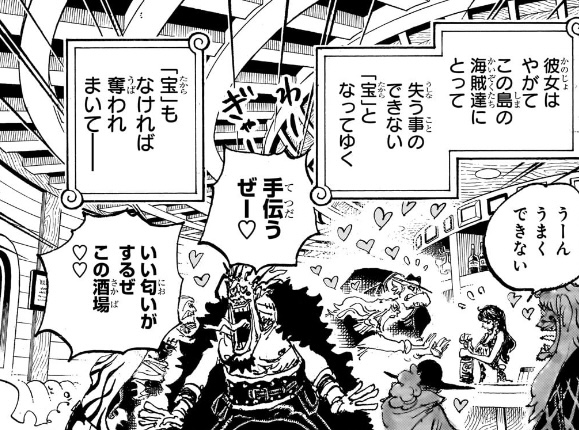 1つは、「強奪シーン」と言っても相手がただの詐欺団体で、しかもそれを知った上で襲っている(作者があえてそのシーンをピックアップして描いている)となると、「ロックス海賊団は無差別に海賊行為を行っているわけではないのか?」(そこには一定の分別や良識、あるいはやポリシーがあり、襲撃する相手を選んでいるのか?)という疑問が生まれ、「単なる無慈悲で非道な極悪人集団ではない」可能性が出てきてしまうという点。