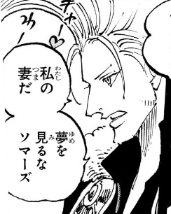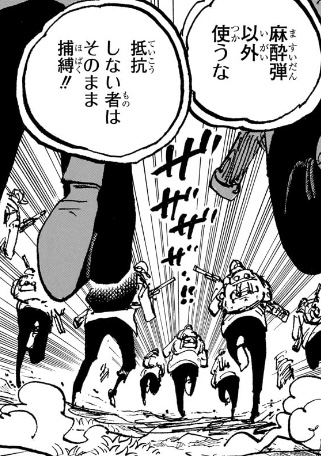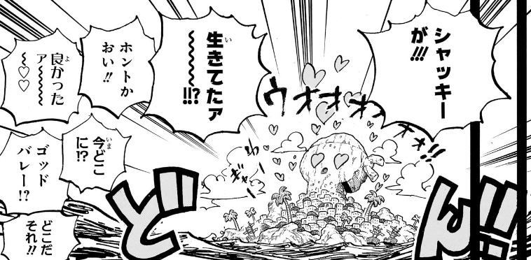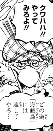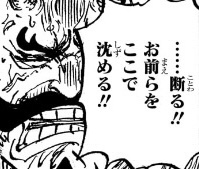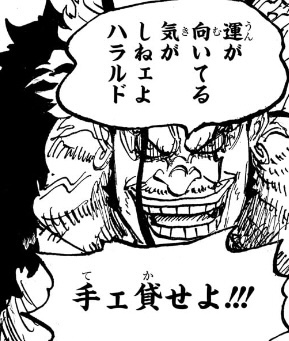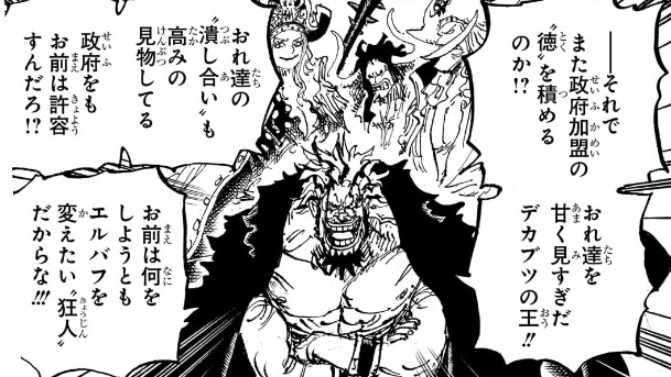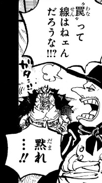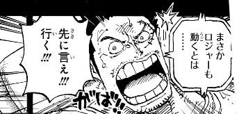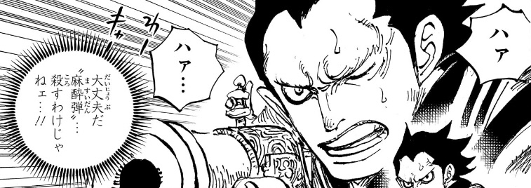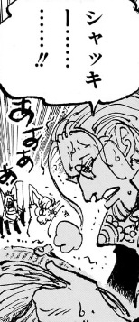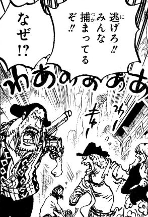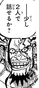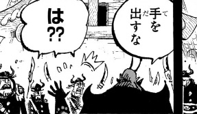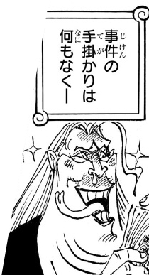 1つ目のコマについては、「おれ達のシャッキーが誘拐されたァ〜〜〜〜!!!」というコマの直後なので、こいつが政府にシャクヤクを売った事を表しているのでしょうが、(金鉱脈がある島を占領し、海軍からも金を奪い取って「楽園」を作ったのだからすでに十分な金を手に入れているはずだというのに)何のために金を求めているのかが相変わらずわからん上、こいつが金に執着してる描写があったわけでもなく、いつそんな密約が交わされたのかもわからないため、作者都合で無理やり「そういうことにした」ようにしか見えません。