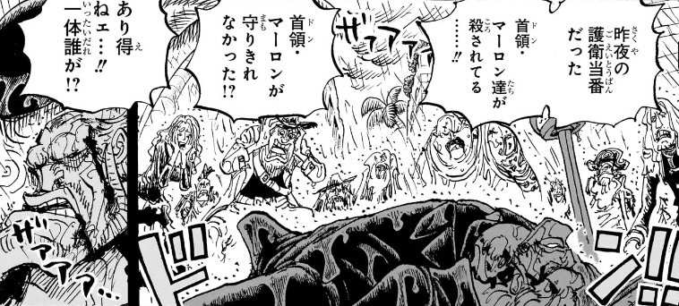 しかし天下の「ロックス海賊団」の幹部をそんな雑魚キャラにするわけにはいかないため、「首領・マーロンが守りきれなかった!?」「あり得ねェ」というセリフによって、つまり他の雑魚モブ達による説明によって、無理やり強キャラに見せ、衝撃的な事件にしているだけなのです。