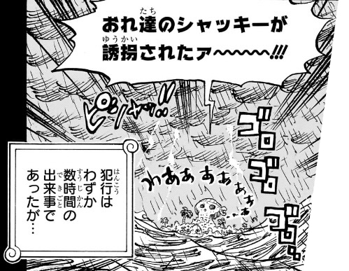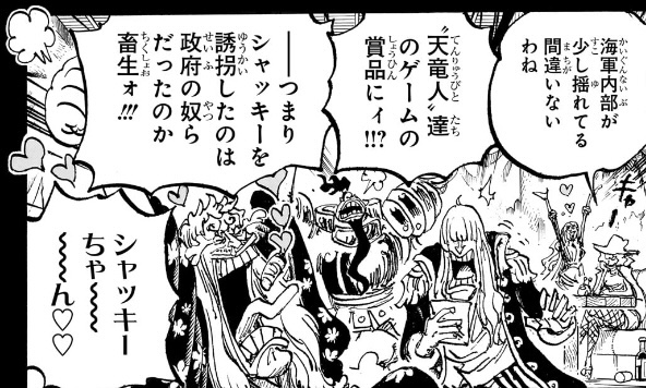 どう考えても、「“天竜人”達のゲームの賞品にィ!!?」「──つまりシャッキーを誘拐したのは政府の奴らだったのか畜生ォ!!!」の後に入れるべきでしょう。