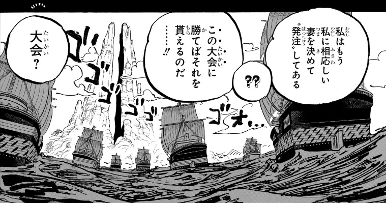 「ガーリングが五老星に次の開催地を進言し、御大も喜ぶだろうと発言」「3年に1回開催している」「海軍を動員する」「氏族戦がある」「誰かが賞品としてシャクヤクを誘拐し、王直に金を払った」「ガーリングがシャクヤクの入手を発注した」みたいな細かい設定が出されると、読者側も細かいことが気になってきちゃう。