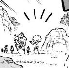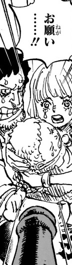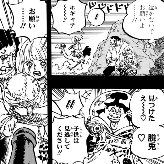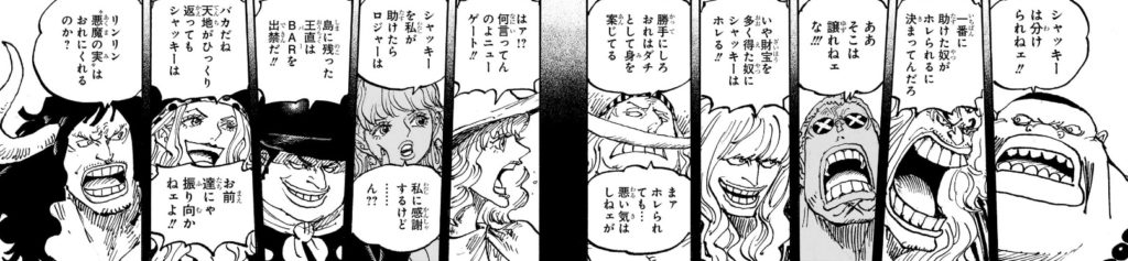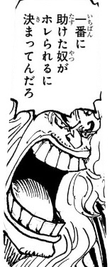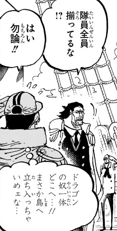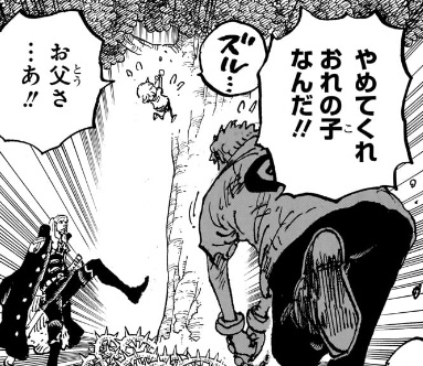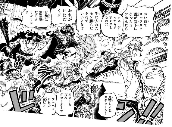 ここからどうやってシャムとシャンクスが天竜人(ガーリング)の息子だと認識され、聖地に持ち帰られる事になるのか想像つきませんが、ドラゴンが連れ去ろうとしているところをガーリングに見つかって奪い返されるか、海軍船に連れて戻ったらガーリングの子供であることがバレて、引き渡すよう命じられるとかそんな感じですかね。。