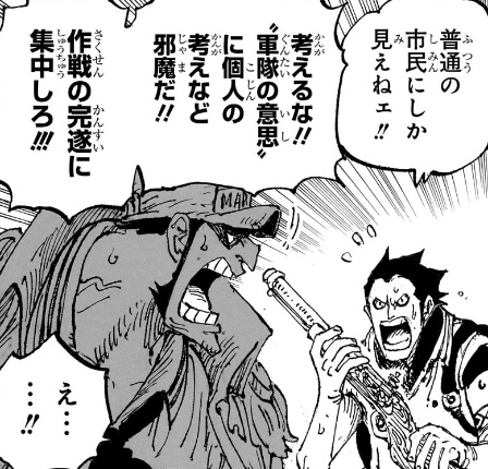 たとえば海兵になりたての頃のコビーがこの場にいても、同じような描かれ方をするでしょうから、「ドラゴンの中身はコビーと変わりません」と言っているようなものであり、その事実を現在のドラゴンの活躍を描く前に明かしてしまったわけです。