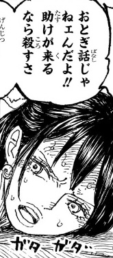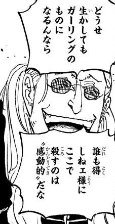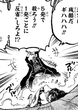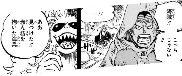もちろん、海兵の立場からすれば天竜人に逆らうことなど御法度なのですが、じゃあこいつはこの先の自分の生き方を、どのように考えているのか(海軍組織に残り、天竜人の下で働き続けるつもりなのか、海軍を辞めてこの狂った世界を変えるために命を懸けようという考えが浮かんでいるのかなど)が描かれていないため、こいつの意志や考えが全く読み取れません。