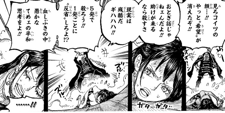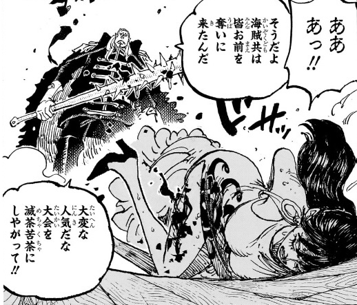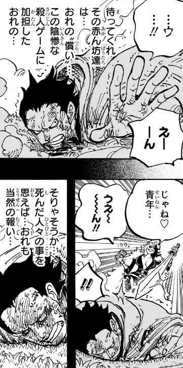攻撃されてもすぐに反撃体制や戦闘体制に移るなら全然いいのですが、(ワンピースの世界において)「肩を貫かれただけ」だというのに、倒れたまま起き上がれず、赤ん坊達を助けることが自分の「償い」であると説明することで、読者への見映えだけ気にして、