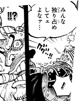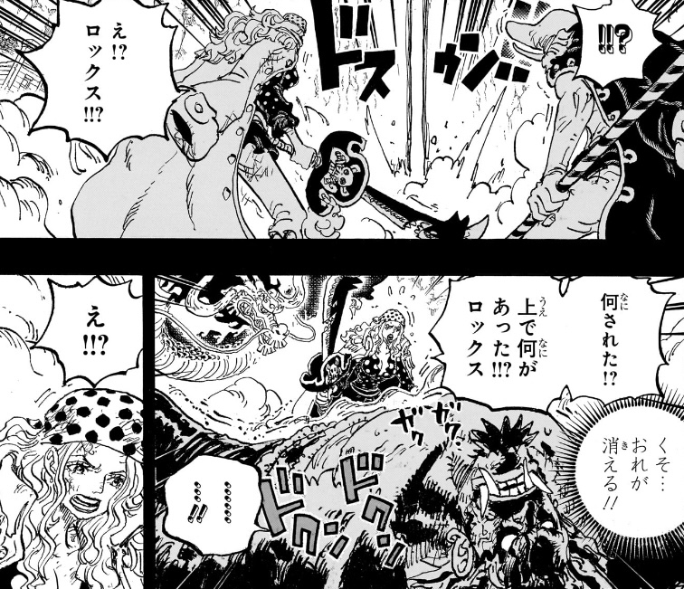 - ロックス海賊団とは「仲間殺しも耐えない凶暴な一味」であり、自分の取り分を増やすため、自分の狙った宝を手にするためには仲間を殺してまで奪い取ることも厭わない集団であり、自分自身、その報復としてカイドウを「殺ス」つもりで襲いかかって行ったくせに、ロックスがカイドウに攻撃したら「てめェロックス!! 味方に何やってんだ!!」と言い出す。これをリンリンに言わせているのが終わってる。せめて白ひげに言わせるべき。