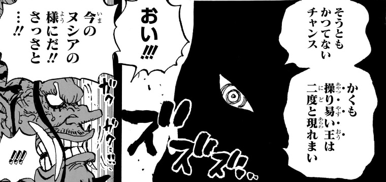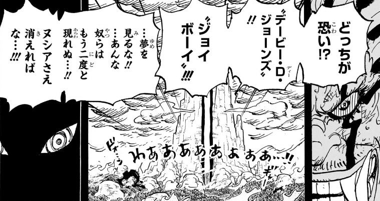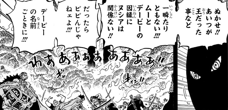「ヌシアさえ消えれば」「あんな奴らはもう二度と現れぬ」ということは、イムの中ではジョイボーイ系統の子孫は全て消せていて、「デービー一族」の生き残りさえ消せれば、天敵となるような相手は二度と現れないと考えている、という事なのでしょうが、そもそも「神の天敵」である「Dの一族」が大量に生き残っていて、その名を名乗るだけでも消されていた過去があるというのに、「ロックスだけ消せば“あんな奴ら”はもう二度と現れない」と考えているなどあり得なさ過ぎて、破綻してるとしか思えない。