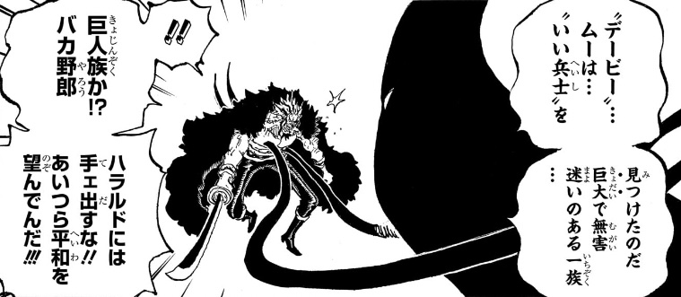 - エルバフの世界政府加盟を拒み続けておきながら、そのトップが巨人族について「“いい兵士”を見つけたのだ」と言い出す。