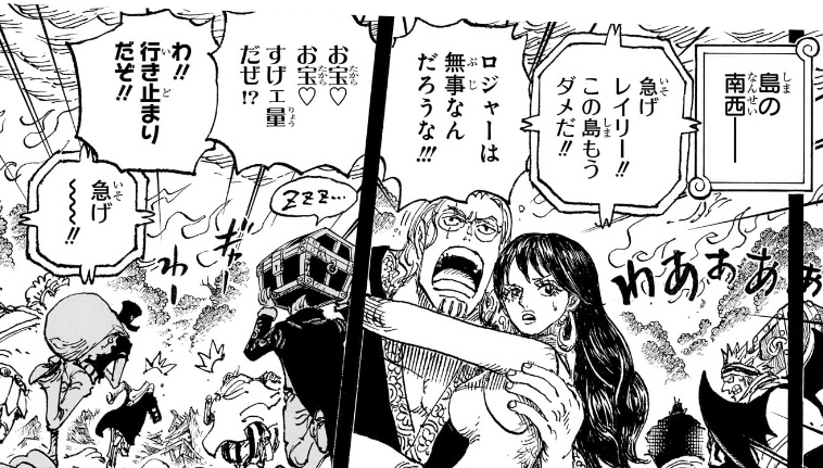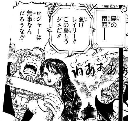 - レイリーのことは島の「南東」に向かわせていて、そこには海軍とロックス海賊団がいるはずなのに、何の苦労もなくすでに「南西」にいるレイリー。