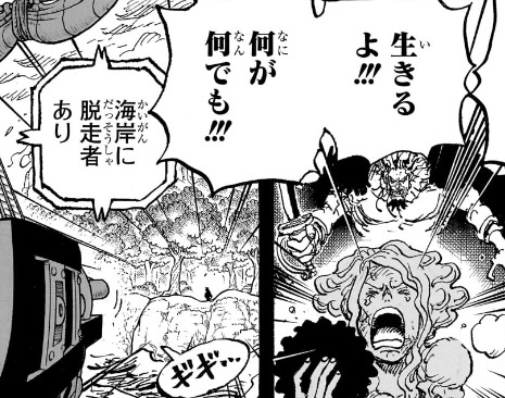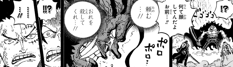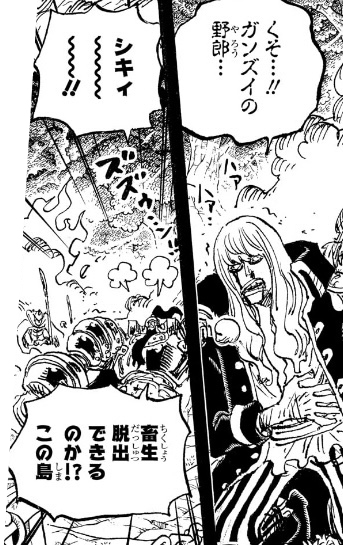 今この場に現れたばかりで、今イムを目にしたばかりなので何もわからないという立場ならまだしも、自分の大技が効かず、敵があっさり復活する不死身の姿を見届けた上で、自分達の船長が敵に捕まり攻撃されて苦しんでいるわけですから、もっと疑問に思うべきポイント、驚き、焦るポイントがたくさんあるはずです。