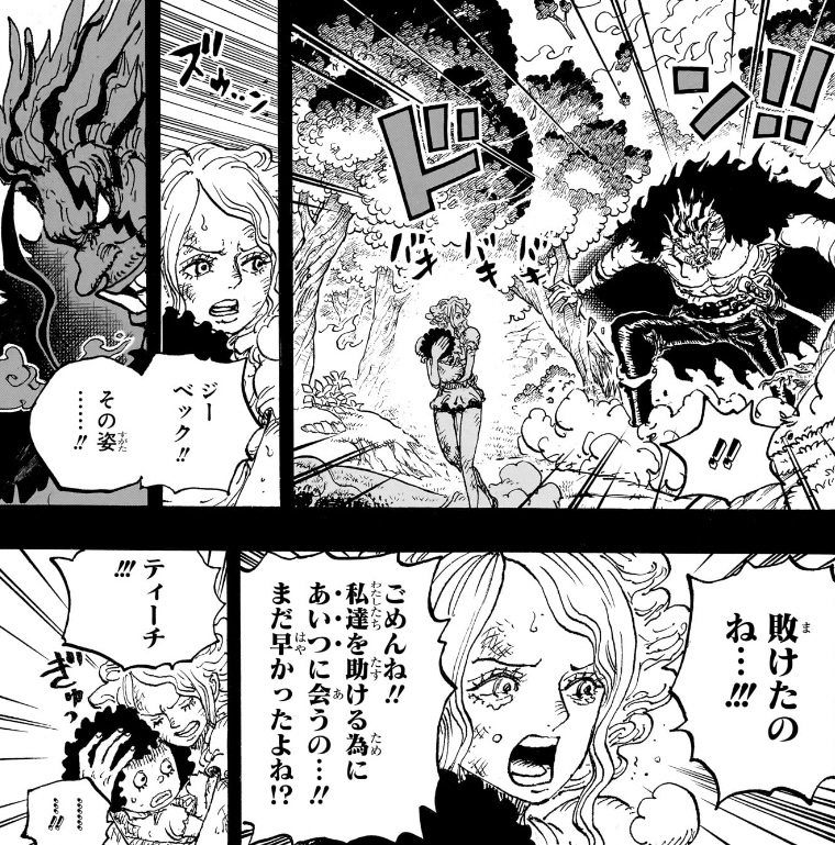 もちろんリンリンは(イムではなく)カイドウを攻撃するために現れたわけなので、イムのことをちゃんと認識していなかった可能性もあると言えるのですが、前話ではカイドウではなくしっかりイムを狙って攻撃する描き方がなされてしまった以上、その言い訳はできません。
