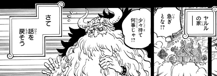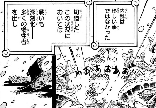 今話で言えば、終わらせ方が唐突過ぎて、本来描くはずだったナレーションを途中でぶった斬ったような印象になっているし、仮に終わらせ方は変わらなかったとしても、もう2ページ(本来ならもう4ページ)あれば、イーダの死も、シャンクスの失踪も、ハラルドの深海契約までの流れも、もっと情報量増やして丁寧に描けたはずなんです。