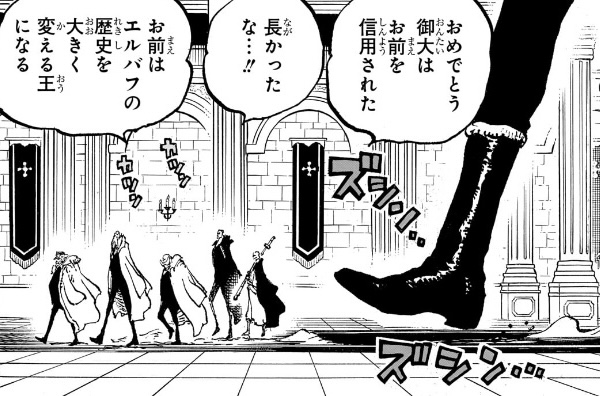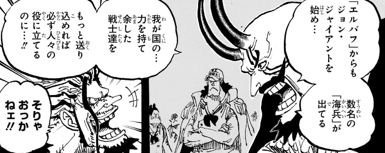 - 「希望する者達は海軍への入隊を促すつもり」でありながら、「エルバフを戦いから脱却させる為」に「世界政府」加盟を望むという意味不明な主張。