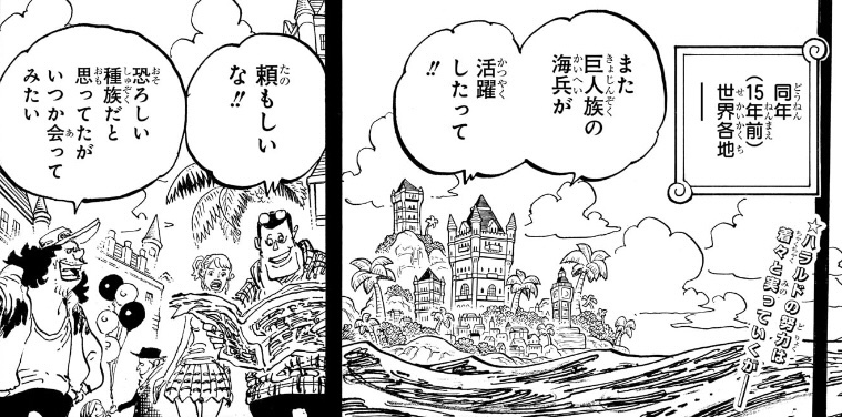 おそらく「ハラルド単体が海軍の援軍として働き出す」→「ロジャー処刑に伴う大海賊時代の到来」→「戦力強化の必要性から巨人族を海軍に投入」→「巨人族海兵の活躍による世間の評価の変化」という流れなのだと思いますが、最初のハラルドの活動を巨人族の働きとして見せない(世界が巨人族の活躍として認識しない)ように描く意味がわかりません。
