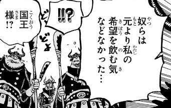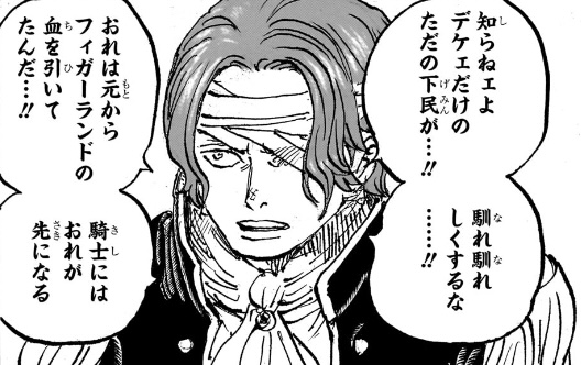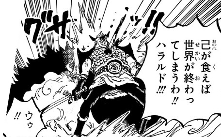 この描写によって、マリージョアで見せた姿は演技だった(ハラルドと顔見知りである事を天竜人達に知られたくないからあえて邪険に扱った)という事を補足しているわけですが、演技だったとしても、👇🏻こんな態度でこんな言葉を返す必要はないし、