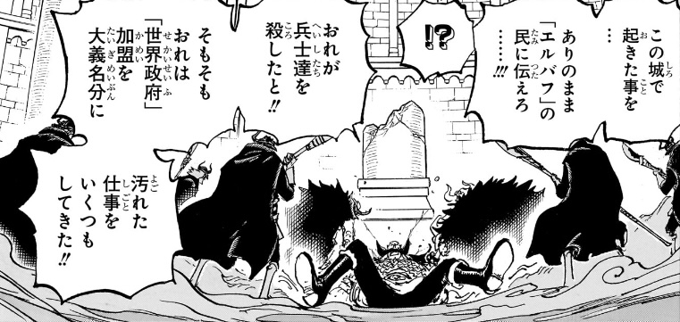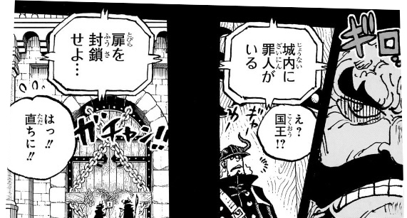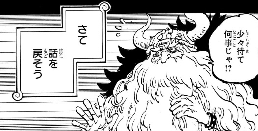 今話では冒頭にシャンクスと降参おじさんによる(ロジャーに息子がいる話をするだけの不毛な)会話シーンを(1ページだけ)描いた後、すぐに場面転換して城のシーンに戻り、数ページ描いた後に、また再びシャンクス達のシーンに戻ってくるという、意味不明な構成になっています。