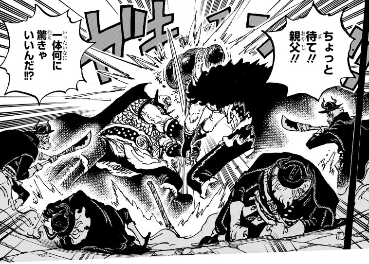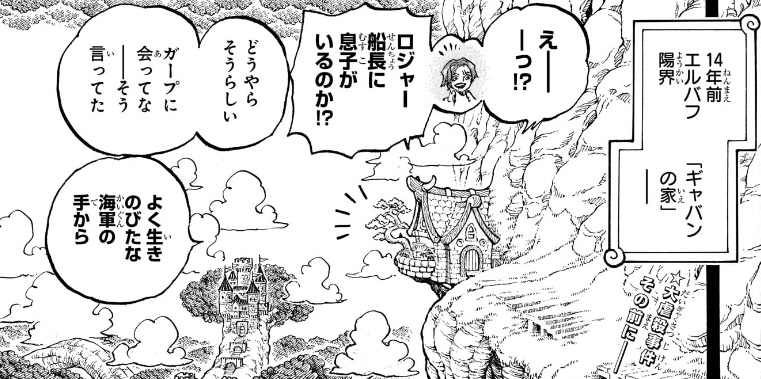 このタイミングでギャバンとの会話シーンを描き直すなら、「何故一度マリージョアに戻ったのか」「なぜまた地上に戻ってきたのか」についてこそ触れるべきであり、ギャバンの立場からしても当然その点に触れるはずで、それによって「1167話で描かれたシャンクスの姿とは何だったのか」を読者に説明すべき(つまりマリージョア失踪後からエルバフ訪問までの間を埋めるべき)だというのに、その点は完全スルーしたまま、急にいつもの穏やかなシャンクスに戻って、全然関係のない「ロジャーの息子」の話を展開してしまいます。