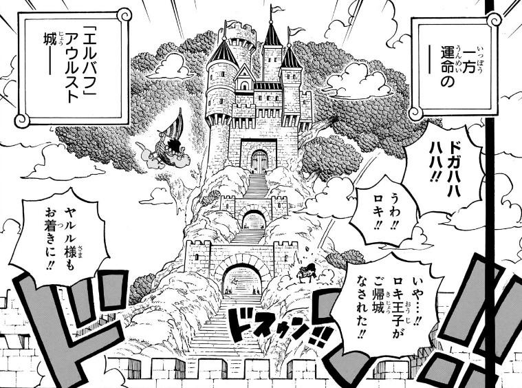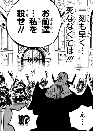 前話のラストを城のシーンにしていたのだから、普通にそのまま城のシーンの続きを描いた上で、シャンクス達のシーンに場面転換して、また城のシーンに戻ってくる、という描き方をすれば、「2回」の場面転換しか発生しないのに、なんと前話を城のシーンで締めた後、「シャンクス達のシーン①」→「城のシーン①」→「シャンクス達のシーン②」→「城のシーン②」と「4回」も場面転換を発生させる構成にしているのです。