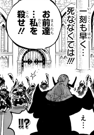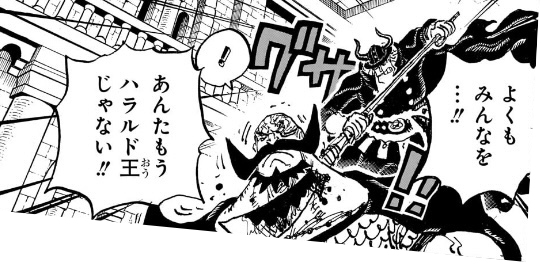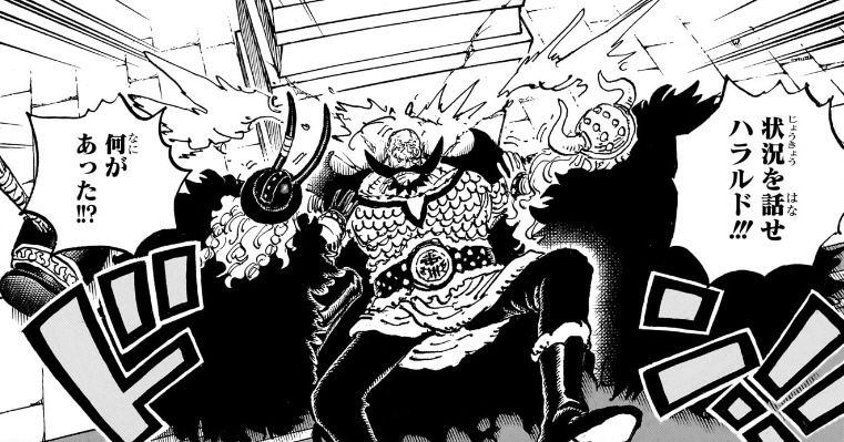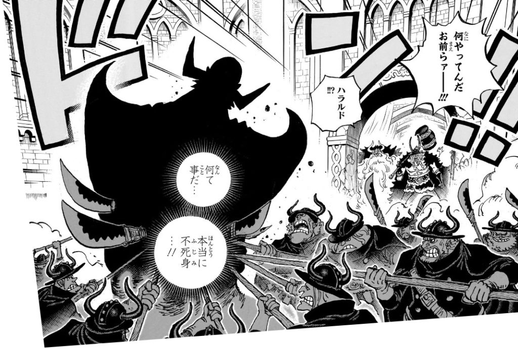 普通の感覚で漫画を読んでいる人間であれば、一般読者でさえ「この冒頭の1ページ、丸ごと不要じゃないですか?(何のために描いているのですか?)」「このページはこの後のギャバンとシャンクスのシーンの方にまとめて、冒頭は前回の続きとして普通にハラルドサイドを描いた方がよくないですか?」と感じるはずですが、そんなことさえ指摘できない、あるいは指摘したとしても聞き入れてもらえないような関係性なのでしょう。