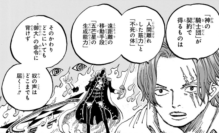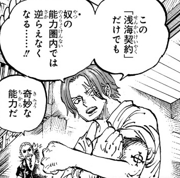 逆にいうと、「浅海契約」であれば、聖地内ではイムの命令に逆らえなくなるが、聖地を出てしまえばその効果は及ばず、「人間離れした筋力」や「不死の体」「遠距離の移動手段『五芒星の生成能力』」は得られず、シャンクスはこれらの能力を有していないという事になります。