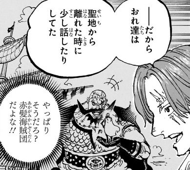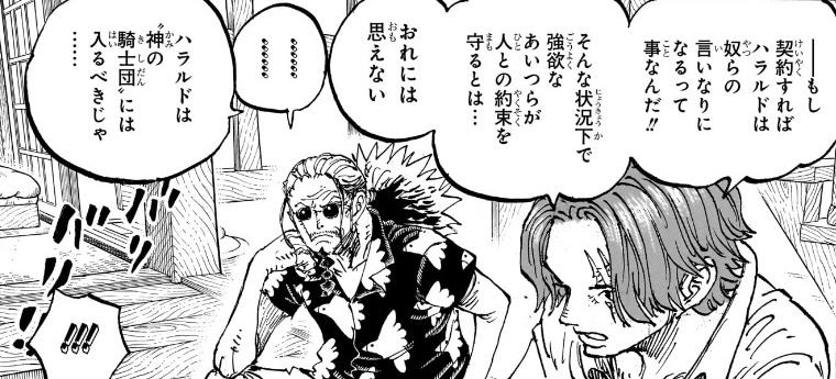 また、シャンクスとハラルドが顔見知りだったことは明かされたものの、いつどこでどのように知り合ったのかについては教えず、これも先送り。