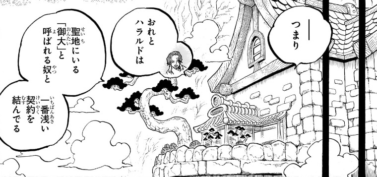 他にも、シャンクスが聖地から離れた際にハラルドと会話するチャンスがあったのに、そのタイミングで「深海契約」の説明をして「ハラルドは“神の騎士団”に入るべきじゃない」という助言をしなかったのも意味不明ですし、イムがシャンクスと「浅海契約」しか結ばなかった(逃げられて、自由に行動され得る状態のままにしていた)理由も不明です。