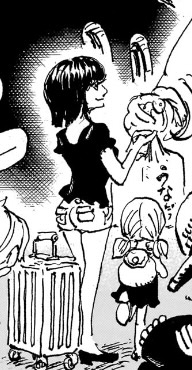 これだけ見たら誰を描いてるのかわかりませんし、右下にいるナミも「麦わらの一味を描いている」という前提がなければ誰を描いているのか判別できないでしょう。というかなんでこんなにロビンと身長差があるんでしょうか。
