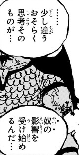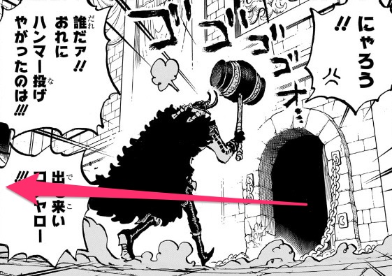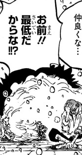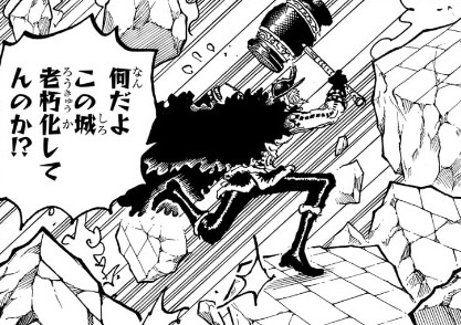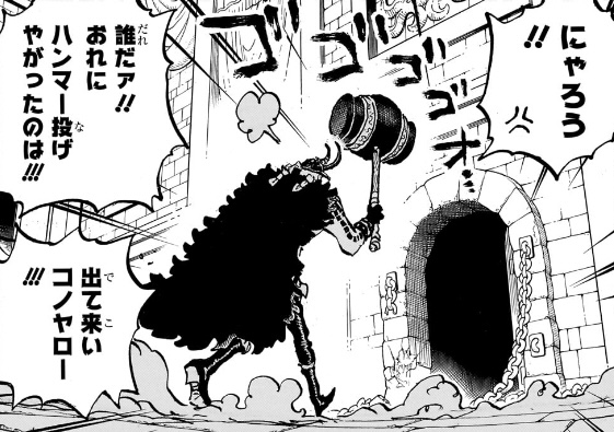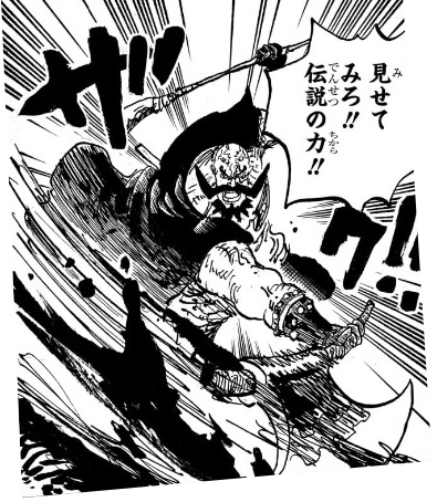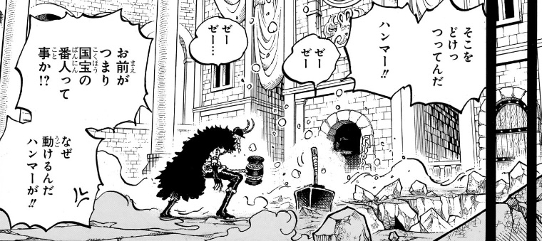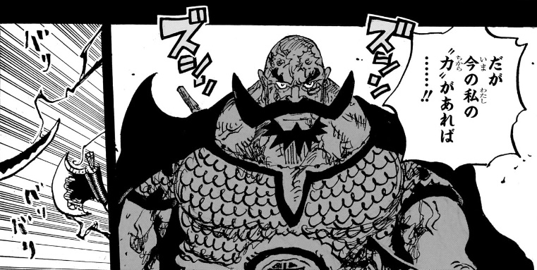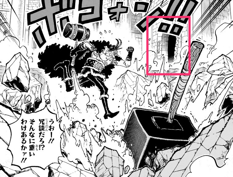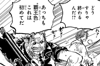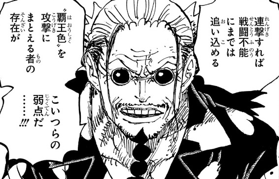 この種明かしの何が肩透かしかと言えば、「覇王色をまとって攻撃すればそれだけでOK」という話であり、要するにワノ国でルフィがカイドウ相手に身につけた戦法を使えばいい、という話でしかないため、この説明をした場では、(一味では)ゾロに対してしか意味のない情報になっていることです。