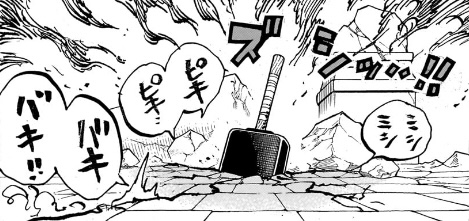 もちろん、ロキに悪魔の実を食べさせないように床を壊して落下させようとした、という事なのでしょうが、そんな事をしたら自分も下に落ちてしまうわけで、その重さやハンマーの構造を考えれば(たとえリスが宿っていて自由に動けるのだとしても、空を飛べるわけではないのですから)戻って来れるはずがありません。