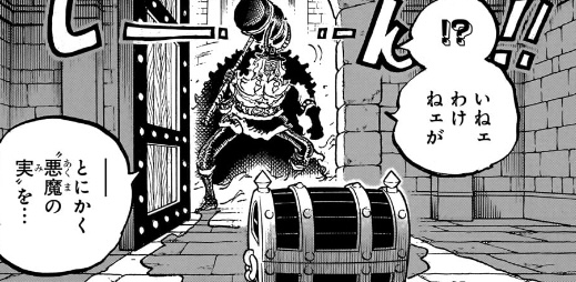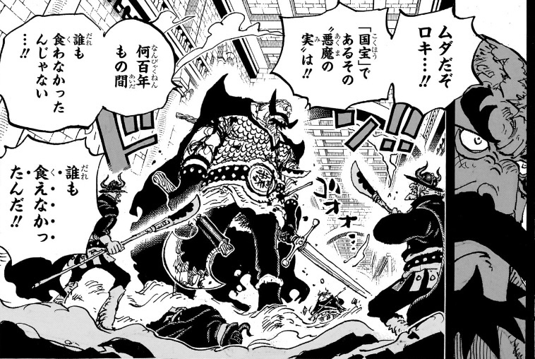 “悪魔の実”を手に入れようとするロキに対して、「ムダだぞロキ…!! 『国宝』であるその悪魔の実は!! 何百年もの間誰も食わなかったんじゃない…!! 誰も食えなかったんだ!! “鉄雷”に誰一人認められずにな!!!」と言い出すのですが、あまりの小手先後付け感に笑ってしまいました。