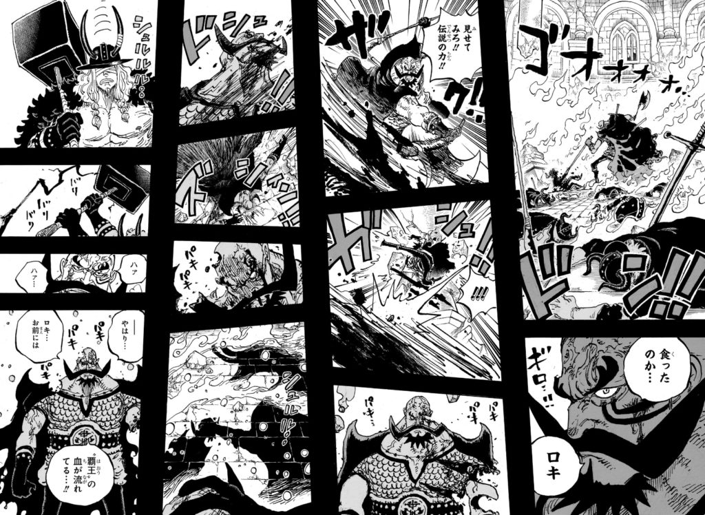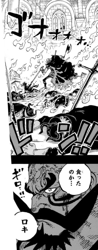 ロキが食べた悪魔の実について(おそらく動物系の幻獣種なのでしょうが)まだ明かさずにシルエットで処理してる点は、またこのパターンかよとは思いつつも、おそらくこの後回想が明けたらお披露目になる(そこまで先延ばしされるものではないし、実際そのタイミングで明かした方がいい)と思うので、まだ目を瞑れました。